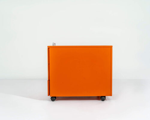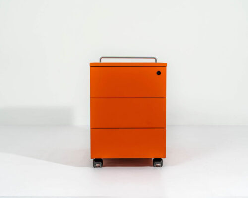 Bloco organizador rodado de madeira pintado a laranja composto por três gavetas e uma bandeja organizadora. Gavetas em corrediças metálicas deslizantes, fecho de segurança com duas chaves. Pega metálica superior para facilitar a sua mobilidade.