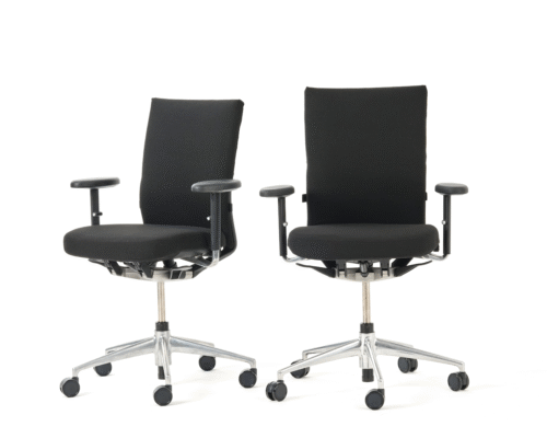 Cadeira giratória e rodada de costas médias. Assento e costas em tecido e braços em borracha. Base de cinco raios em poliuretano e sistema de elevação pneumática. Regulação do assento em profundidade, reclinação das costas com sistema LiveBack® e apoio lombar, ambos com alavanca de pressão. Cadeira com braços novos, espuma nova, rodas novas, amortecedor "gasfit" novo e tecido novo Trevira na cor preta. ⁕ 5 anos de garantia. ⁕ Prazo de entrega: 5 a 10 dias úteis. Realizamos entregas a nível mundial. Para envios fora de Portugal e Espanha, por favor, entre em contacto connosco para receber um orçamento personalizado. Para mais informações sobre preços, consulte-nos através do email info@ikonisch.pt ou pelo telefone +351 913 068 270. -