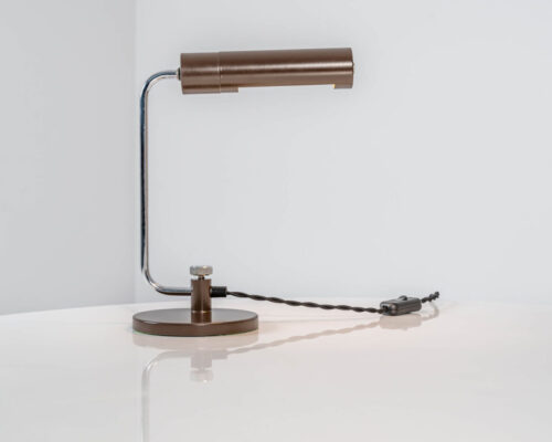 210,00 €Candeeiro de mesa "Piano Lamp" castanho escuro desenhado por H. Th. J. A. (Herman Theodoor Jan Anthoin) Busquet para a Hala Zeist. Base em ferro fundido sob chapa de aço lacada, braço em aço cromado com regulação longitudinal com manípulo para fixação. Quebra-luz lacado com diâmetro de 4,5cm. Casquilho E14, interruptor de centro e fio de tecido. -