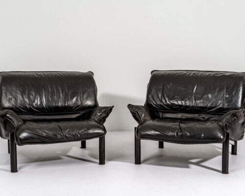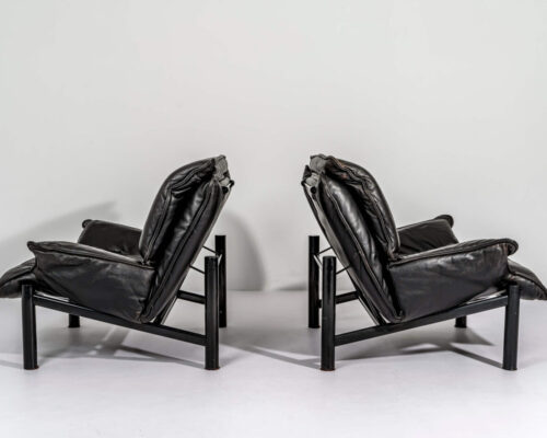750,00 €Poltronas em pele natural preta. Trabalho Italiano dos anos 70 com estrutura em perfis de alumínio lacados a preto. Sistema de reclinação do assento em calha e mecanismo de regulação da almofada das costas. Atenção: Preço unitário -