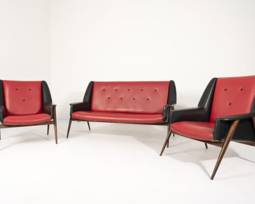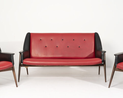 Out of stockConjunto de Sofás Vintage duplo e individuais desenhado pelo icônico José Espinho um dos pioneiros do design de mobiliário em Portugal. Sofá desenvolvido por volta de 1960 com estrutura em madeira e pés em madeira de sucupira. Assento e costas em pele sintética vermelha, apoio de braços e laterais em pele sintética preta. Altura do assento: 36cm