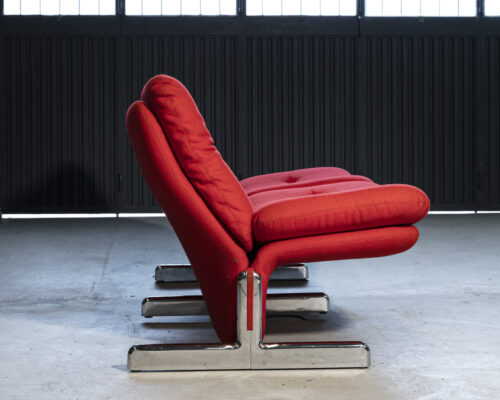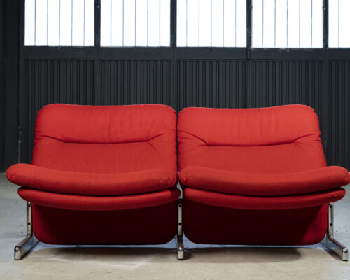 380,00 €Sofá duplo fabricado em Portugal nos anos 70 sob patente, de origem italiana, dos designers Tatina Ammannati & Giampiero Vitelli. Design elegante e esbelto com estofado revestido em tecido de cor vermelha, e estrutura em forma de "T" invertido em aço cromado contendo pormenor no mesmo acabamento do tecido do estofado. Altura do assento: 43cm / Profundidade do assento:48cm / Altura do encosto: 47cm -