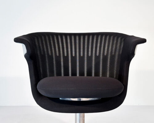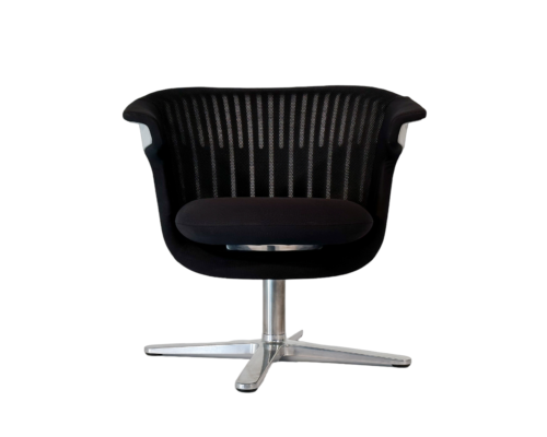 500,00 €Poltrona individual, com braços, rotativa. Costas em PP com revestimento em rede mesh ventilada e assento com almofada rotativa em espuma moldada revestida a tecido. Base de pé central rotativa em alumínio polido. -
