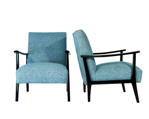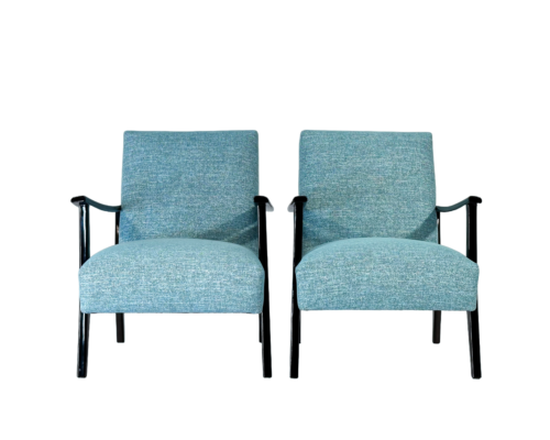 600,00 €Poltronas individuais com braços de design português dos anos 70´s. Estrutura totalmente recondicionada e lacada na cor negra com meio brilho, assento e costa com novo estofo revestidos a tecido mesclado de azul e branco. Atenção: Preço unitário -