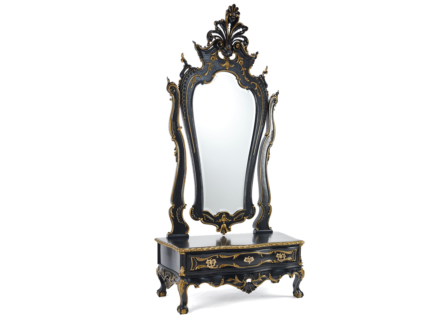 A unique and rare piece of Portuguese antique furniture, handcrafted between the late 19th and early 20th century. This sculptural console mirror is made entirely of solid chestnut wood, featuring intricate, hand-carved baroque detailing. The tall, full-length mirror is framed by an undulating silhouette with lavish ornamental motifs, crowned by a crest of volutes and acanthus leaves. The black matte finish is elegantly contrasted with hand-applied antique gold highlights, enhancing its elaborate contours.