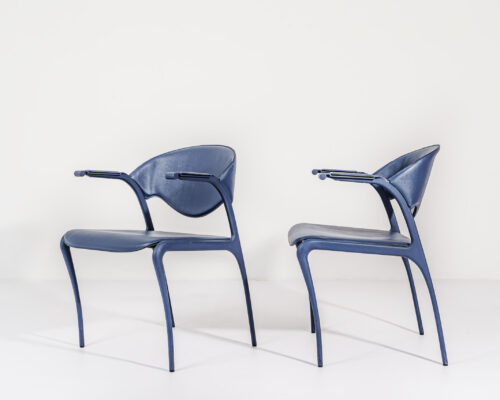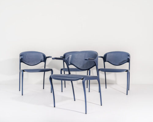 240,00 €Silla de visita con brazos. Estructura en aluminio con pintura texturada en azul. Asiento, espalda y brazos revestidos en cuero natural en color azul. -