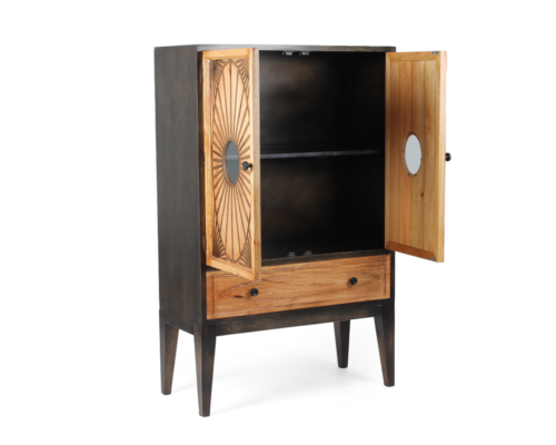 Out of stockArmário de apoio para sala decorativo com L=96x P=43 x H=153. Portas superiores de abrir com pequenas janelas em vidro, prateleira interior fixa, gaveta na parte inferior de extração total. Estrutura totalmente em madeira com motivos decorativos e estéticos em chapa de latão cortada à mão e vidros nas portas de abrir.