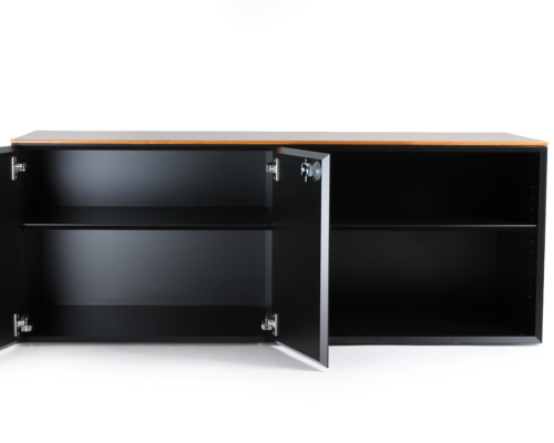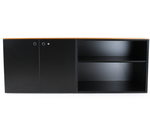Armário apoio duplo da linha Quaranta5 inspirados na ideia de perfis a 45º com tampo em madeira envernizada inteiro, com módulo com portas de abrir com fechadura e uma prateleira amovível e módulo sem portas com uma prateleira amovível. Atenção: Valor unitário. Realizamos entregas a nível mundial. Para envios fora de Portugal e Espanha, por favor, entre em contacto connosco para receber um orçamento personalizado. Para mais informações sobre preços, consulte-nos através do email info@ikonisch.pt ou pelo telefone +351 913 068 270. -