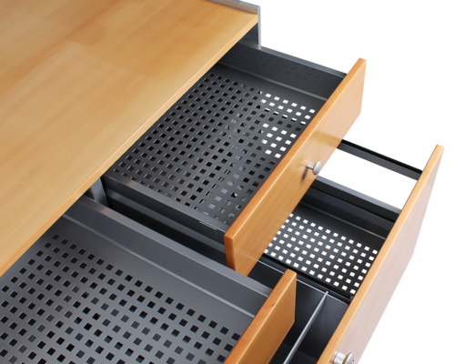 Out of stockAparador lateral multi-funcional com a possibilidade de usado em diferentes funcionalidades tanto para escritório como para casa. Laterais em chapa de aluminio polido com raios laterais e tampo e frantes de gavetas em madeira de bétula envernizada à cor natural sem chaves. Gavetas superiores e gavetão para colocação folders ou pastas.