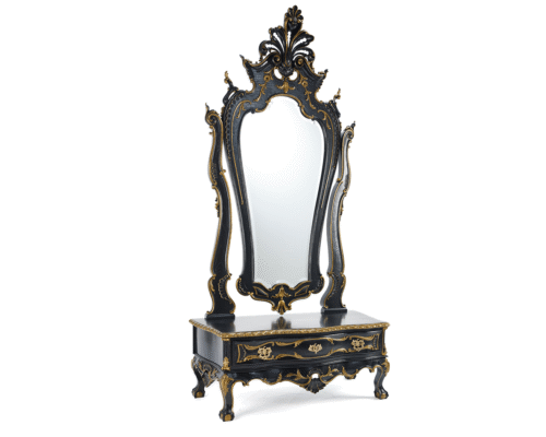 Peça única de mobiliário de inspiração barroca, produzida artesanalmente em Portugal entre o final do século XIX e início do século XX. A estrutura é inteiramente executada em madeira maciça de castanho, ricamente esculpida à mão, com detalhes ornamentais que evidenciam uma mestria decorativa singular. O espelho de corpo inteiro está delicadamente embutido numa moldura ondulante e elaborada, culminando num coroamento esculpido com motivos de volutas e acantos, pintados em preto profundo com detalhes em dourado patinado que realçam a sua expressividade.