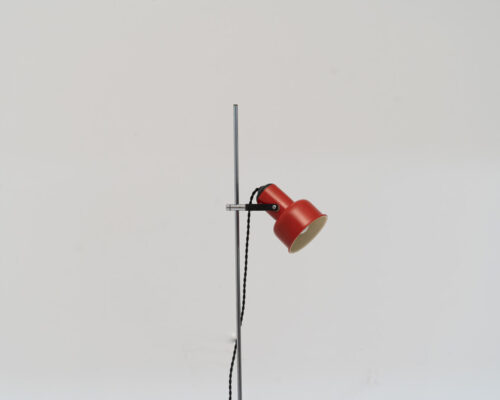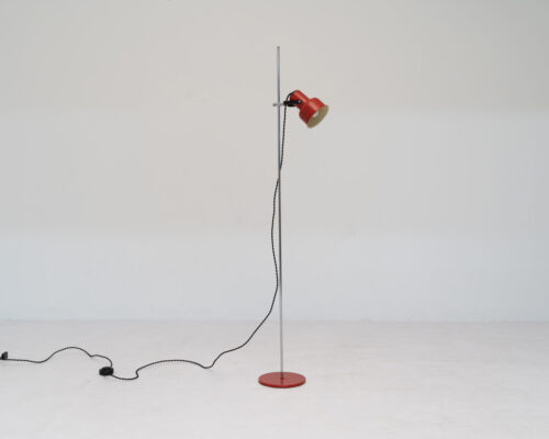 Candeeiro de pé vintage com esbelta estrutura tubular em aço cromado, base de suporte e abajur metálico pintado na cor vermelha com altura regulável. Casquilho E27 com interruptor de pé.