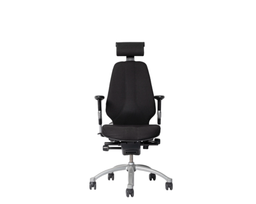 Out of stockCadeira operativa giratória e rodada de costas altas com apoio de cabeça rotativo regulável em altura. Assento e costas em tecido. Base de cinco raios em alumínio e sete manípulos para ajuste. Três botões ao longo do assento permitem a elevação pneumática; regulação do ângulo das costas e ajuste em profundidade do assento. Alavanca das costas permite a regulação da altura e a bomba de pressão o enchimento do apoio lombar. As duas manivelas localizadas por baixo do assento permitem regular a pressão e o travamento do movimento das costas e do assento. Braços reguláveis em altura e amplitude 360 graus.