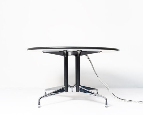 1.950,00 €Desenhada por Charles e Ray Eames e fabricada pela Vitra, este modelo Segmented conta com uma estrutura de quatro raios e quatro apoios em alumínio destinado para tampos redondos. Suporta um tampo original com com conduta de cabos oculta em melamina branca com borda boleada em borracha preta. Contamos com variadas soluções personalizadas para o tampo desta mesa. -