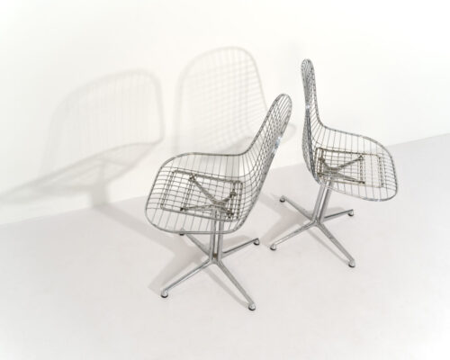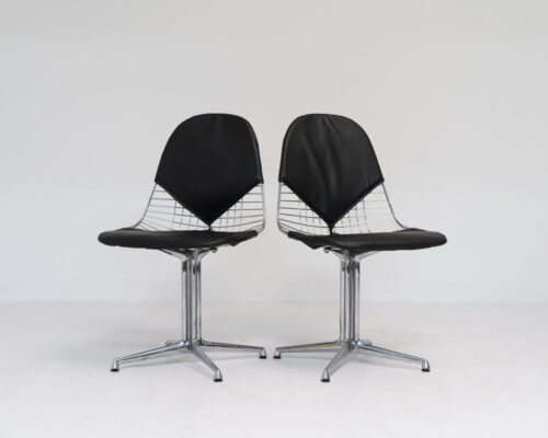 Out of stockDesenhado por Charles e Ray Eames em 1951, a Wire Chair foi concebida com a premissa de criar um objecto leve e durável com o menor uso de materiais. Estas duas unidades têm base "La Fonda" com etiqueta de produção da Vitra sob licença da Herman Miller - detalhe que confere a sua idade. Exemplares dos anos 60 com etiquetas originais nas bases e marcas de uso e patine - assentos em bom estado de conservação.