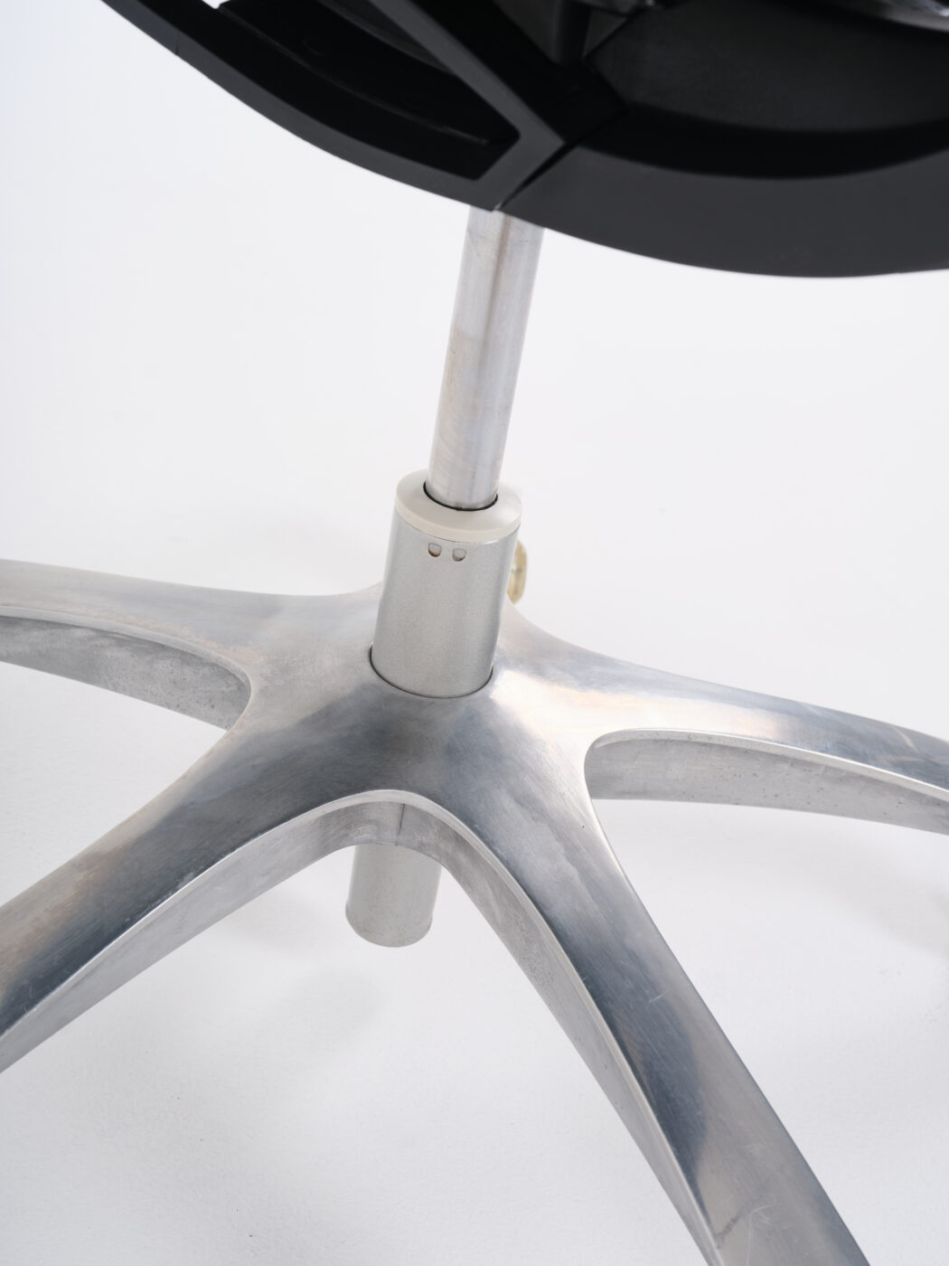 Cadeira operativa modelo Generation com base em alumínio polido. Desde 1938, a Knoll construiu uma excelente reputação com base nos seus móveis para casa e escritório. A empresa foi fundada por Hans e Florence Knoll, que se esforçaram para criar novos designs ao mesmo tempo que se mantiveram fiéis à filosofia Bauhaus de que os móveis modernos deveriam complementar e não entrar em conflito com o espaço arquitetónico. A Knoll baseia os seus projectos na interação das pessoas com o ambiente, com ênfase no design moderno e durável. Tal resultou num portfólio de produtos exclusivos.